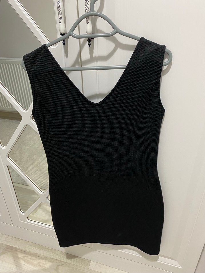 V yaka, kolsuz ve midi uzunlukta siyah, vücuda oturan kadın elbise. Pürüzsüz sentetik kumaştan üretilmiş, minimal ve gotik tarzda günlük kullanıma uygun. Bir kere giyilmiştir s m l bedenler için uygundur