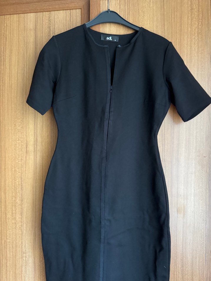 Düz siyah, V yakalı, kısa kollu ve fermuarlı midi elbise. Ofis için uygun, şık ve sade normcore tarzda.