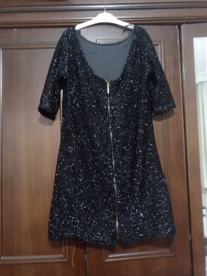 V yaka, kısa kollu, önü fermuarlı siyah midi elbise. Fitted kesimi, sade ve koyu tarzıyla romantik akşamlar için uygun, cozy goth tarzında. ✨