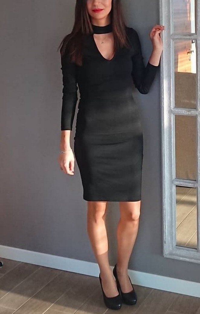 V yaka ve uzun kollu, siyah, midi kalem elbise. Boğaz kısmında bir dekolte pencere dedikleri açıklık var. Onjn dışında düz, vücudu güzel saran, kalın kumaşı olduğu için iç göstermeyen şık bir elbise. Uzun çizmelerle de hoş bir havası oluyor