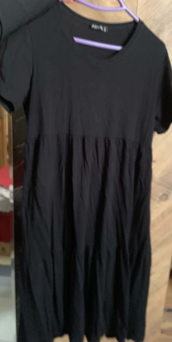 Siyah midi keten elbise, kısa kollu, V yakalı ve pile detaylıdır. Rahat kesim ve minimalist sokak stili için uygundur.