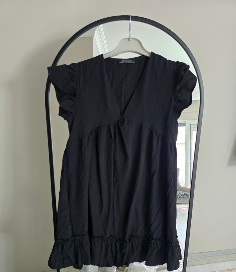 Siyah midi boy keten elbise, V yaka ve bol kesimle, kısa volanlı kollara ve volanlı eteğe sahip. Nefes alabilir kumaş, minimalist gotik tarz için uygun.