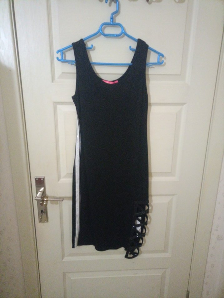 Siyah, v yaka ve yan kısmında bağcık detaylı yırtmaçlı, vücuda oturan midi mini elbise. Sentetik kumaştan, günlük kullanıma uygun.