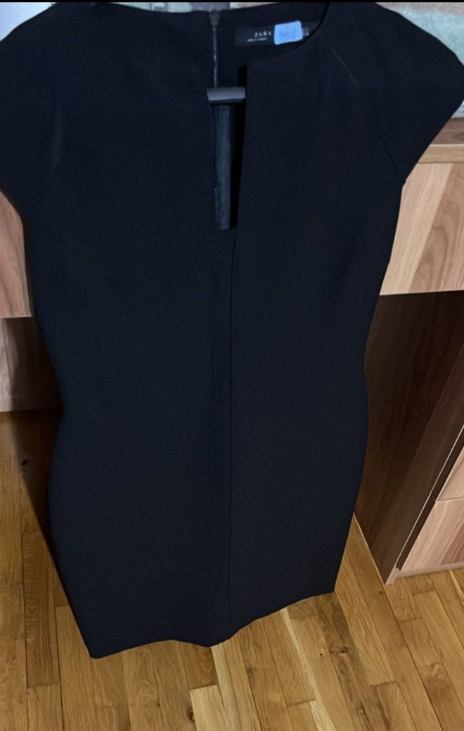 Siyah, V yaka ve yırtmaçlı, vücuda oturan midi elbise. Kolsuz tasarımı ve çağdaş stiliyle ofis ortamına uygun şıklık sunar. onu hafif dekolteli