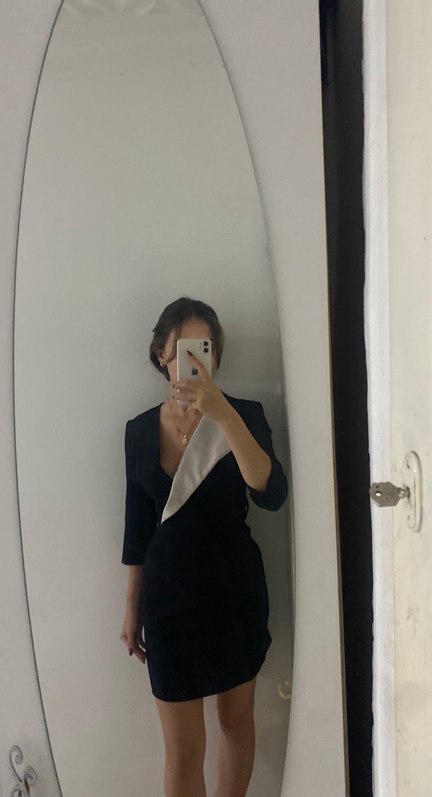 Siyah midi elbise, V yaka ve uzun kollu, ipeksi kumaştan, yırtmaç detaylıdır. Güncel ofis tarzı için regular fit sunar. Beyaz kısımları biraz rengi garip olmuş cıkar mı cıkmazmı bilmiyorum