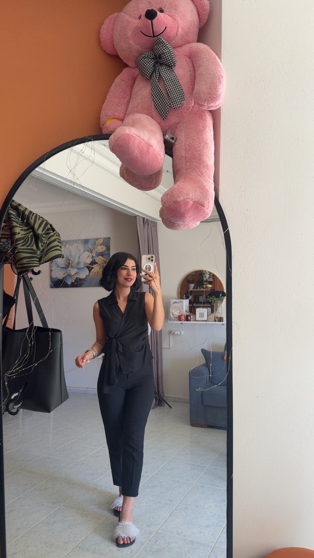 Siyah, V yakalı ve kolsuz midi gömlek yırtmaç detayıyla ve ipeksi dokusuyla ofis kullanımına uygun, rahat kesimlidir.