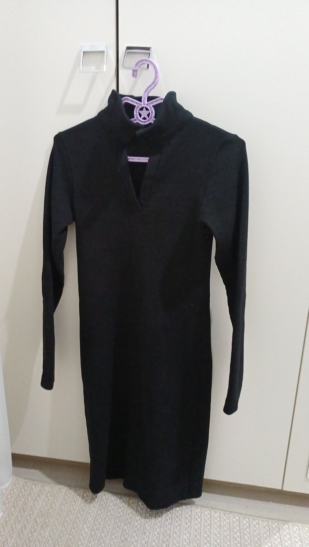 Siyah, uzun kollu, V yakalı ve midi boy, yumuşak ve sıcak kumaştan yapılmış dar kesim elbise. Gotik tarzda şık ve rahat bir görünüm sunar.