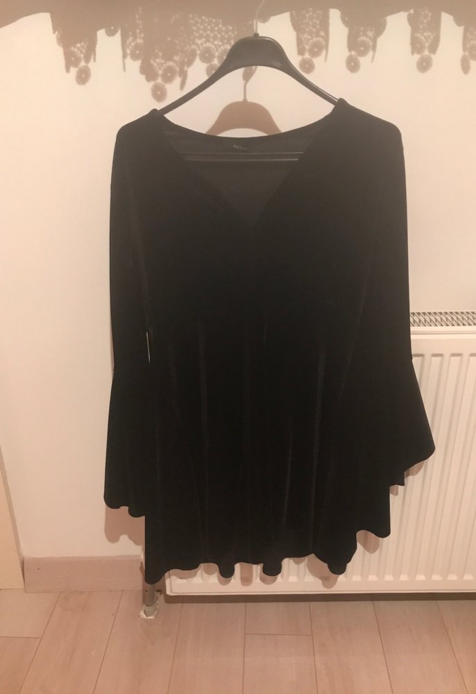 Siyah midi elbise, uzun kollu ve V yakalıdır. Gevşek kesim ve dökümlü tasarıma sahip, gotik tarzda gündelik kullanıma uygun.