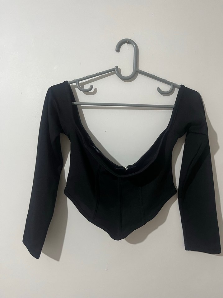 siyah mini bluz, V yaka ve uzun kolludur. Sentetik kumaştan üretilmiştir, günlük kullanıma uygundur.