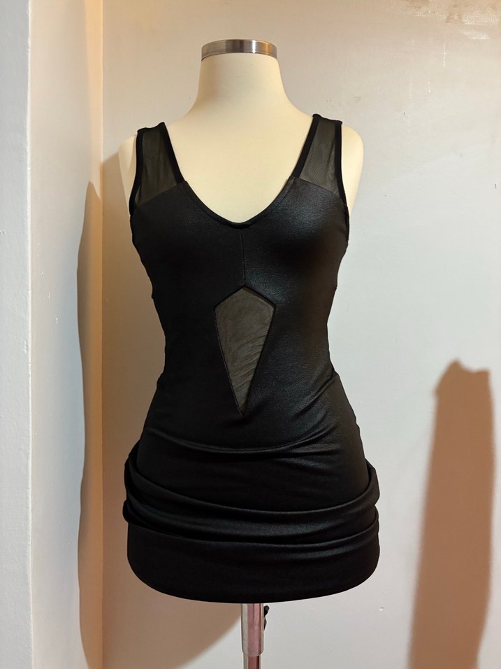 Deri görünümlü, transparan dekolteli mini elbise. Hiçbir sorunu yoktur 1 kere kullanıldı.