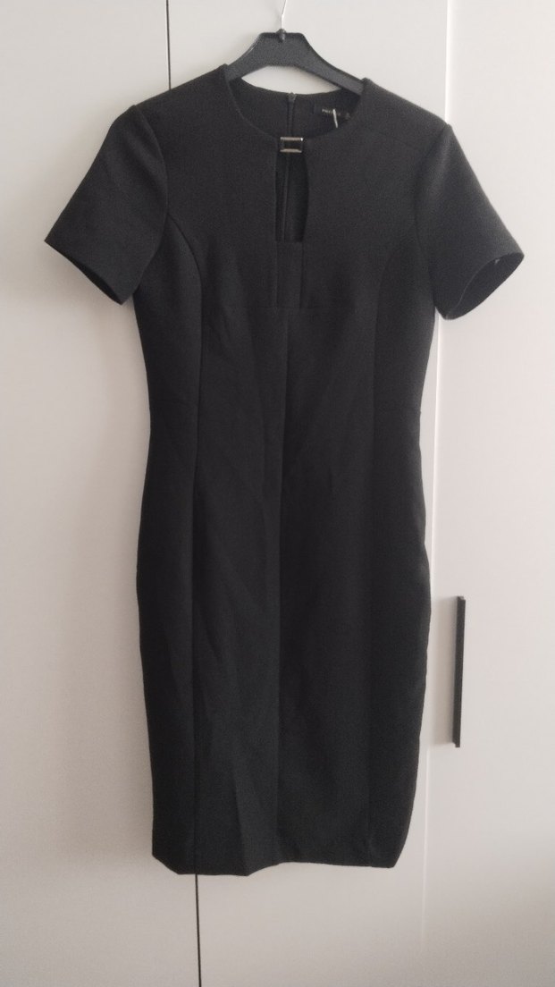 Siyah renkli, kısa kollu, V yaka ve yırtmaç detaylı, normal boy midi elbise. Ofis için uygun, şık ve sade tasarım.