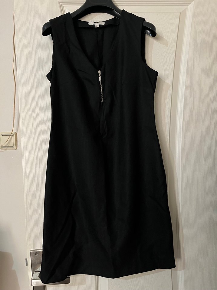 Siyah, kolsuz, v yaka detaylı, vücuda oturan minimalist gotik tarzda elbise.