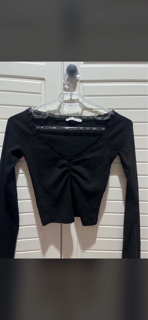 V yaka ve fırfırlı detaylara sahip siyah, dar kesim bluz. Uzun kollu ve mini boyda, keten kumaştan günlük kullanıma uygun.