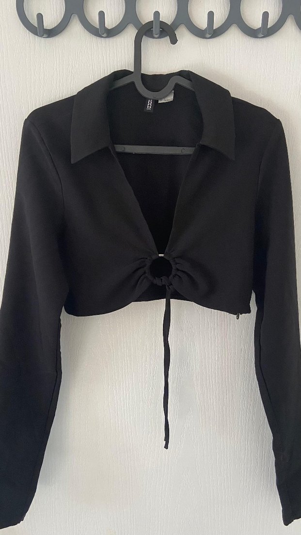 Siyah, uzun kollu, V yakalı ve kısa kesim kadın bluz.