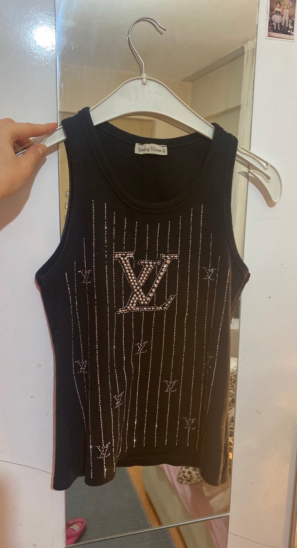 Siyah, v yakalı, kısa kesim, payet işlemeli ve baskılı, dar kesim kolsuz atlet. Trendy ve günlük kullanıma uygundur. ✨