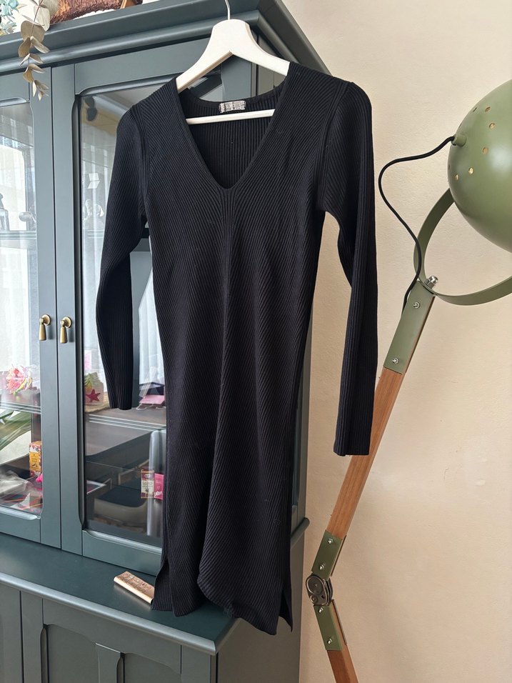 Siyah renk, V yaka ve uzun kollu triko elbise, sade tasarımıyla günlük kullanıma uygundur.