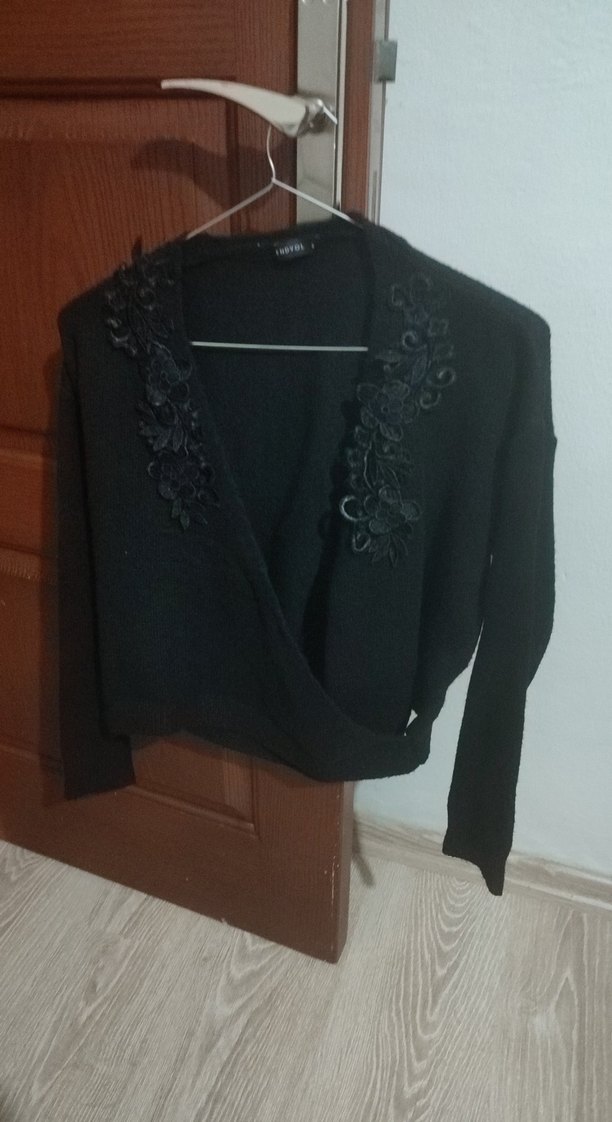 Siyah V Yaka Nakışlı Triko Kazak
