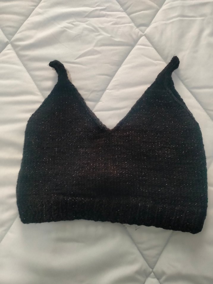 Siyah örgü crop top, v yaka ve ince askılı, mini boyda, vücuda oturan kesimde. Günlük kullanıma uygun sade gotik tarzda. 150tl