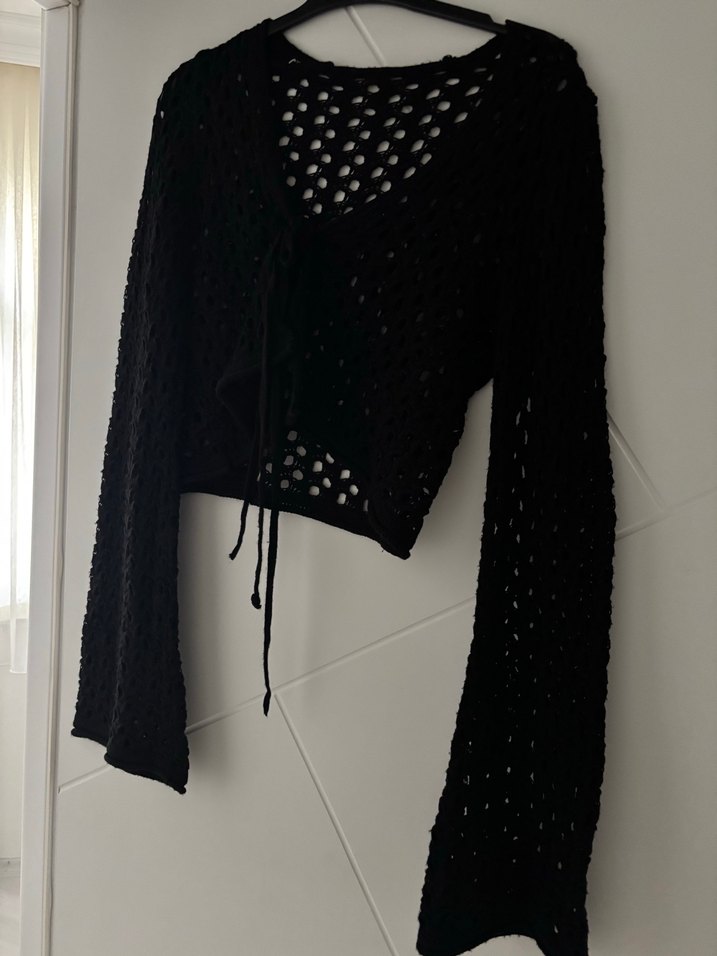 Siyah renkli, V yakalı ve uzun kollu örgü kazak. Gotik tarzı ve midi boyuyla günlük kullanıma uygun şık bir parça.