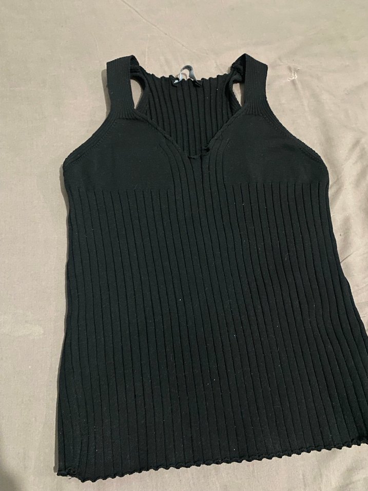 Siyah, V yaka, örgü ve vücuda oturan kesimiyle günlük kullanıma uygun şık bir kadın atlet.