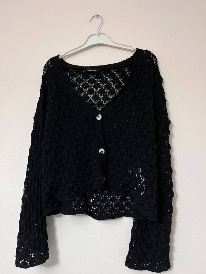 Siyah renkli, V yaka ve uzun kollu, bol kesim midi uzunlukta örgü hırka. Bohem ve goth tarzıyla günlük kullanıma uygundur. İçine bralet,crop ile şık kombinler yapılabilir