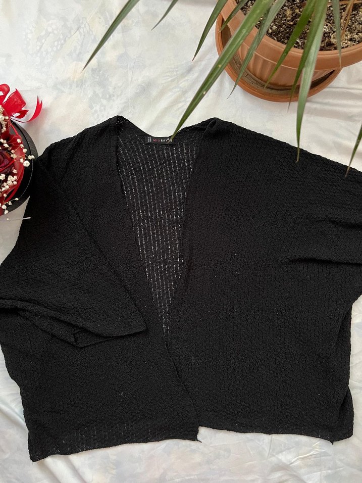 Siyah, uzun kollu, V yaka örgü kadın hırka. Bol kesim ve desen içermeyen rahat bir tasarıma sahiptir.