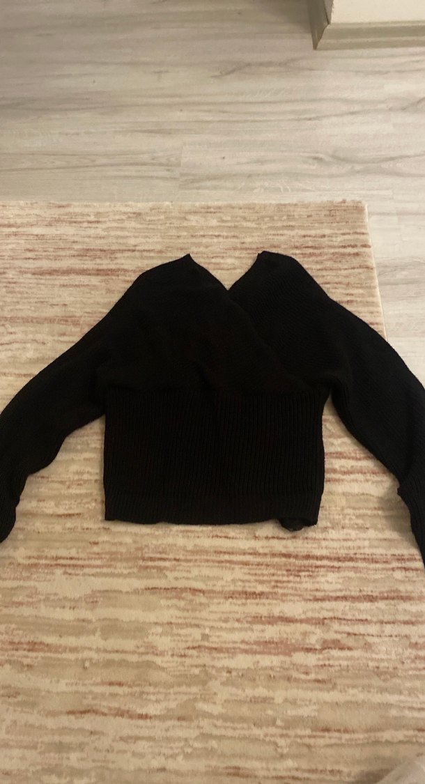 Siyah renkli, V yaka, uzun kollu örgü kadın kazak. Rahat kesimi ve normal boyu ile gündelik kullanıma uygun, trend gotik tarzda bir parça.