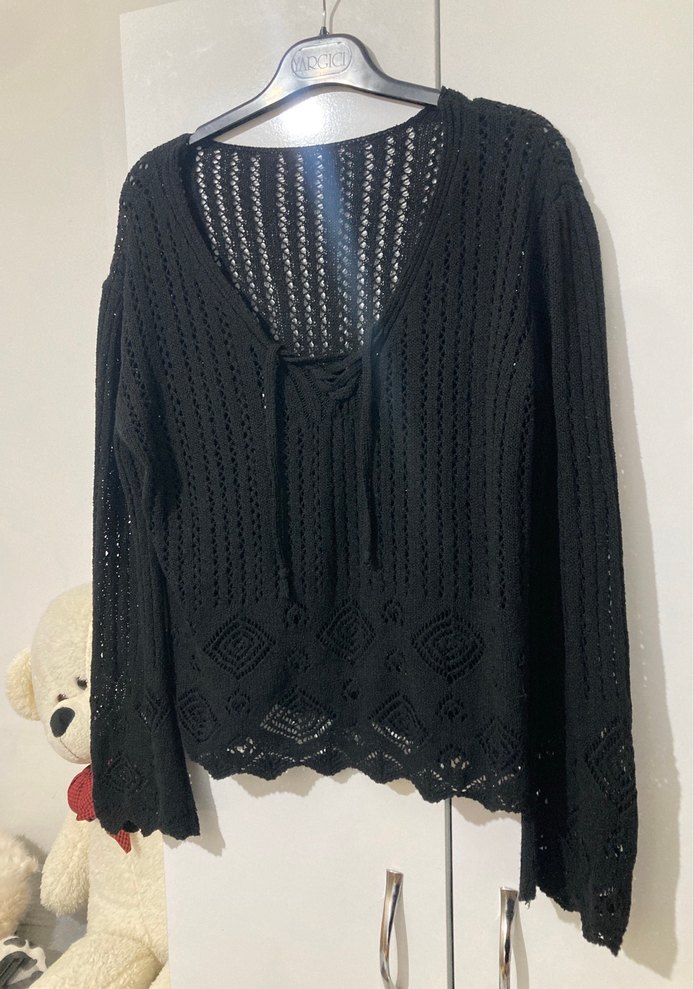 Siyah renkte, V yakalı, uzun kollu ve bol kesim örgü kadın kazak. Rahat ve gündelik kullanıma uygun, gotik ve bohem tarzda.
