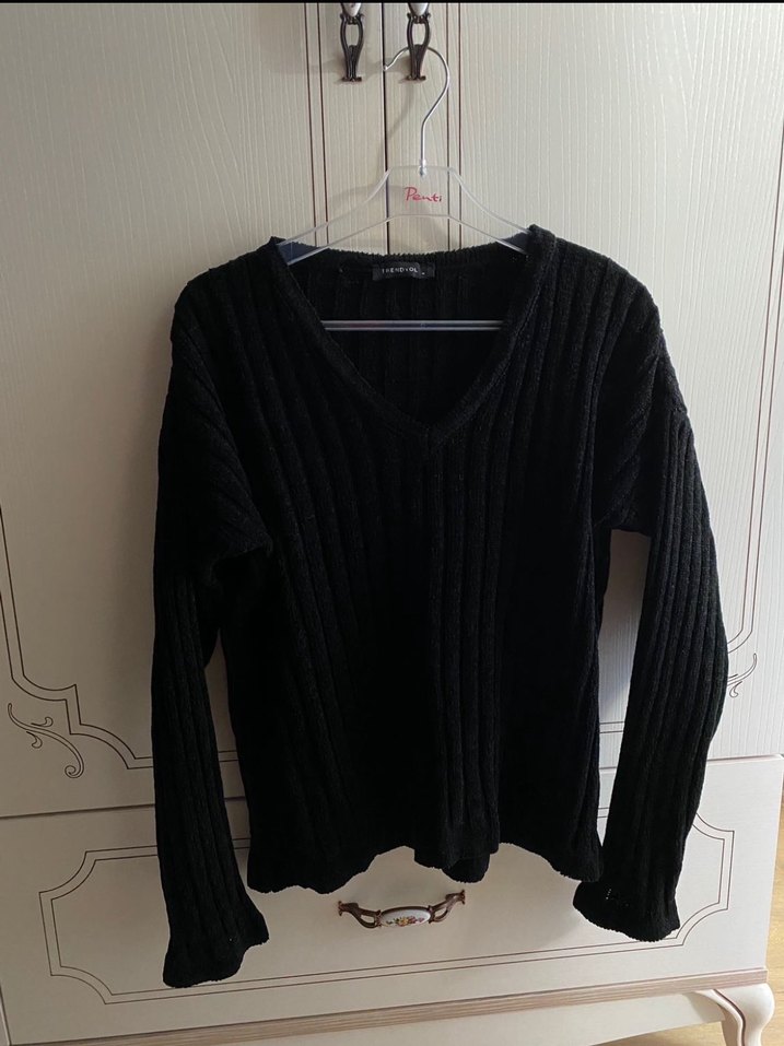 Siyah V yaka triko kazak. Yumoş bir yapısı var. Sadece bir defa yıkandı,ama hiç giyilmedi. İki koltuk arası en 53 cm ama esneklik payı var dahada genişleyebiliyor,boy 55 cm.