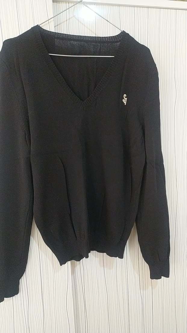 Siyah renkli, V yaka, uzun kollu örgü kadın kazak. Yün kumaştan, bol kesim ve normal boyda, günlük rahat sokak stiline uygun. kollarında şeritler var