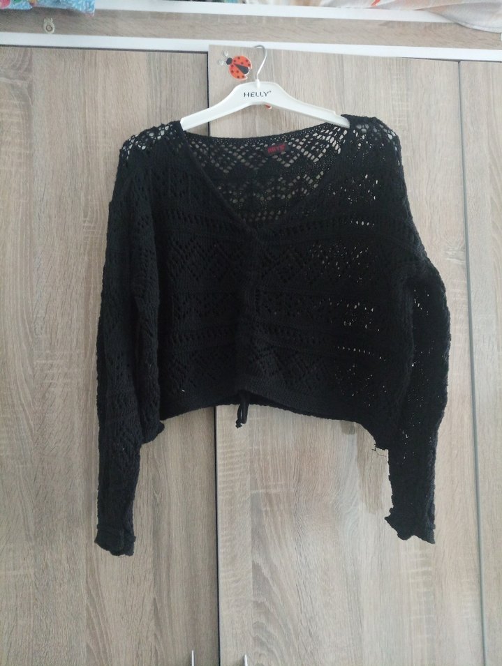 Siyah örgü kazak, V yaka ve uzun kollu, bol ve kısa kesimdir. Desensiz tasarımı, rahat ve gotik tarzıyla uyumludur.