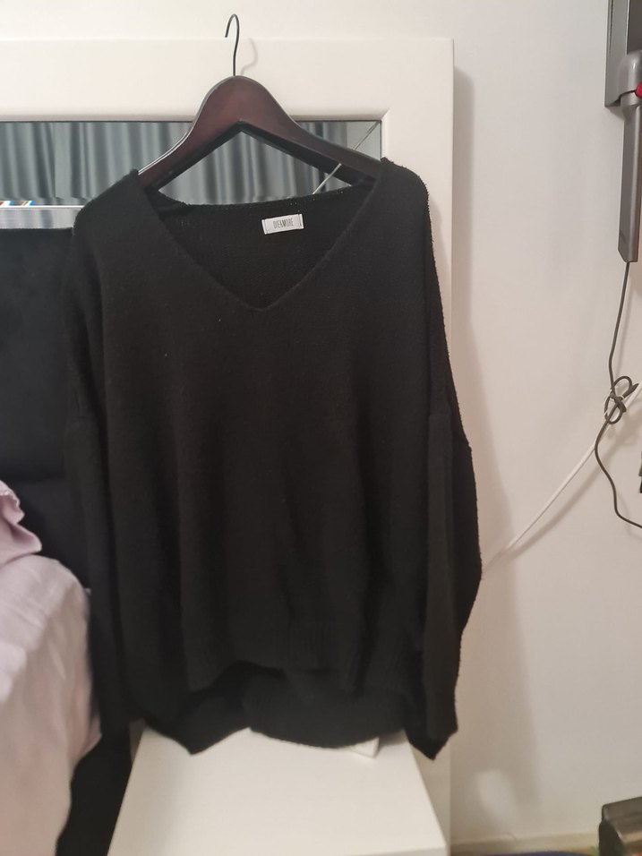 Siyah, uzun kollu, V yaka, örgü yün kadın kazak. Rahat kesimi ve midi boyuyla gündelik kullanıma uygun, gotik tarzda şık bir parça.