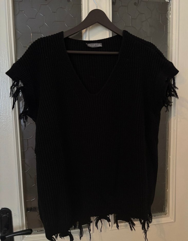 Siyah örgü kadin süveter, V yaka ve bol kesimlidir. Kısa kollu, püsküllü detaylı, rahat goth tarzı günlük kullanım için uygundur.