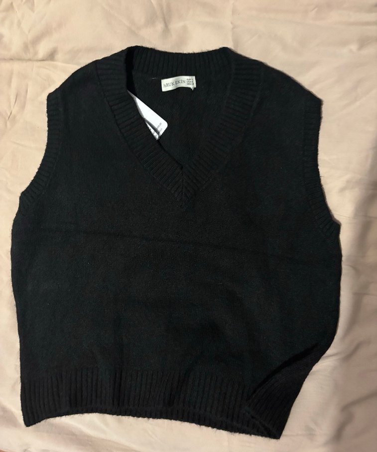 Siyah örgü yün kumaştan, V yaka ve kolsuz tasarıma sahip, rahat bol kesim kadın süveter.