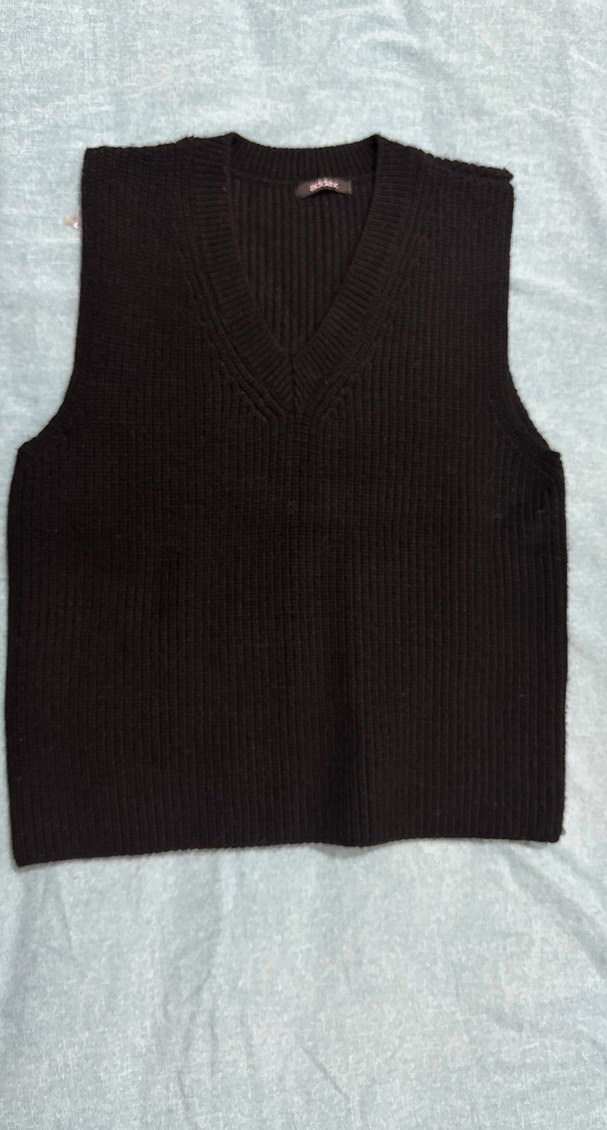 Siyah yün örgü kadın süveter, V yakalı ve bol kesimlidir. Kolsuz ve normal boyda, günlük sokak stili için uygundur.