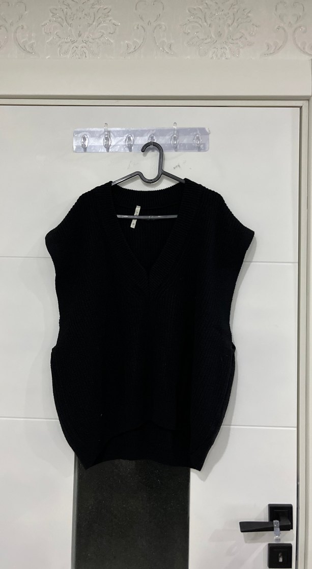 Siyah örgü, V yaka, kolsuz ve bol kesim kadın süveter.