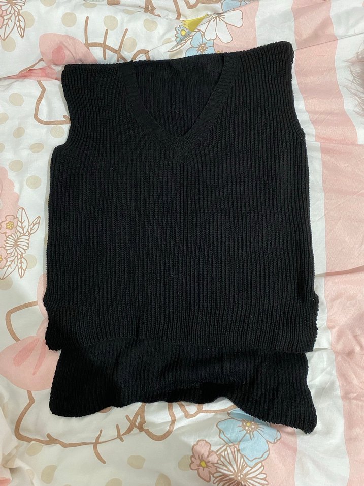 Siyah renkte, V yaka ve kolsuz örgü kadın süveter. Bol kesim ve yumuşak keten kumaştan, gündelik kullanıma uygun rahat goth tarzında.