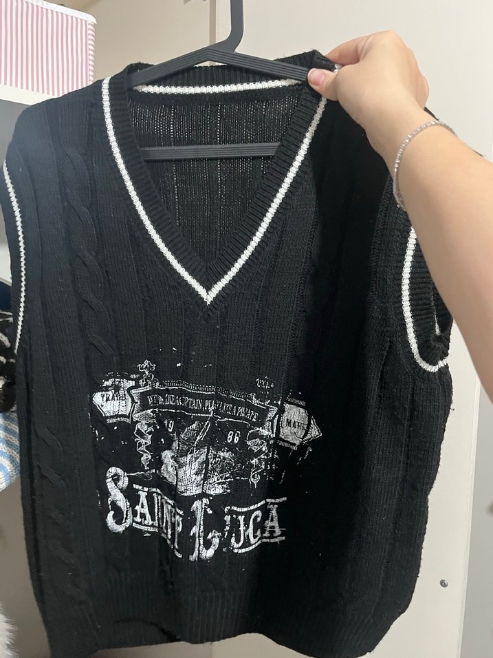Siyah, V yakalı, örgü kadın süveter. Baskılı, salaş kesim, günlük kullanıma uygun grunge punk tarzı.