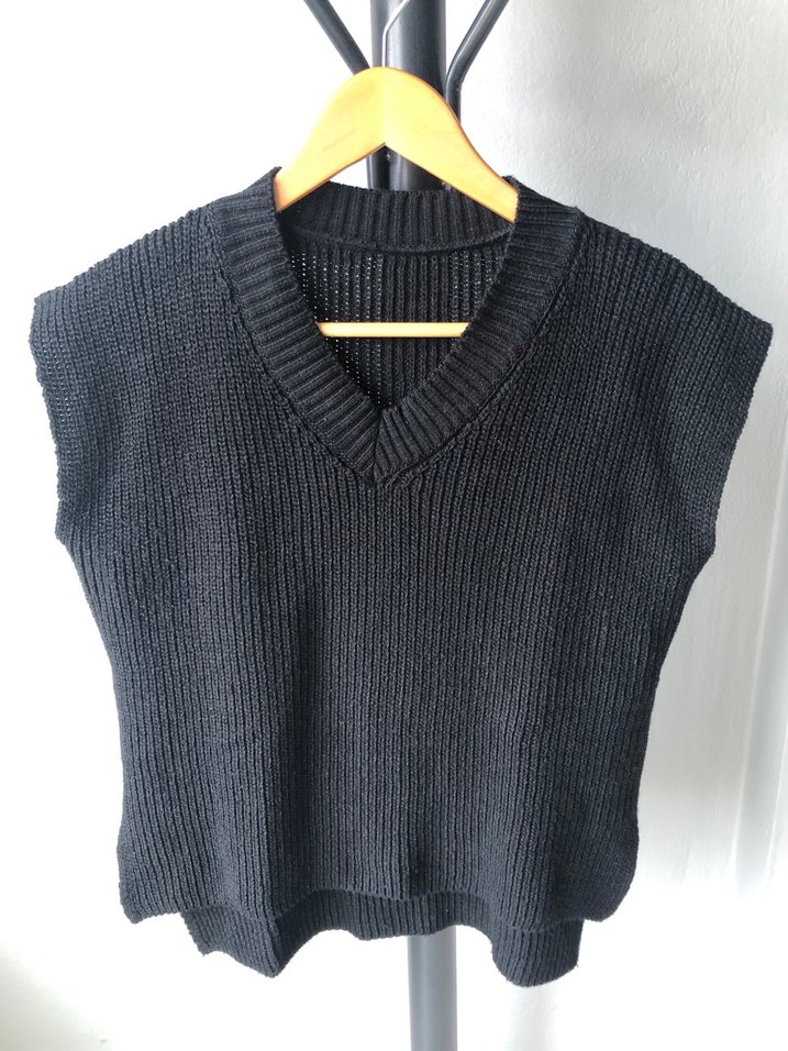 Siyah renkli, V yaka ve örgü kumaştan yapılmış kadın süveter. Kolsuz, bol kesim ve normal boyda, gündelik kullanıma uygun sade tasarıma sahiptir. Mağazamızın tanıtım çekimlerinde kullanılmış ürünüdür.Sadece çekimler sırasında manken tarafından kullanıldığı için mağazada satışa konulmayarak yıkanıp burada satışa sunulmuştur. #triko#kazak