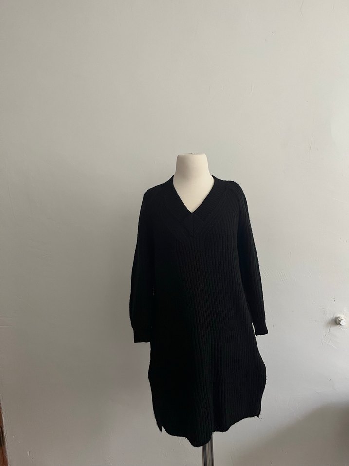 Siyah renkli, V yaka, uzun kollu kadın triko. Yumuşak yünden örülmüş, gevşek ve midi boyda, rahat bir kesime sahip.