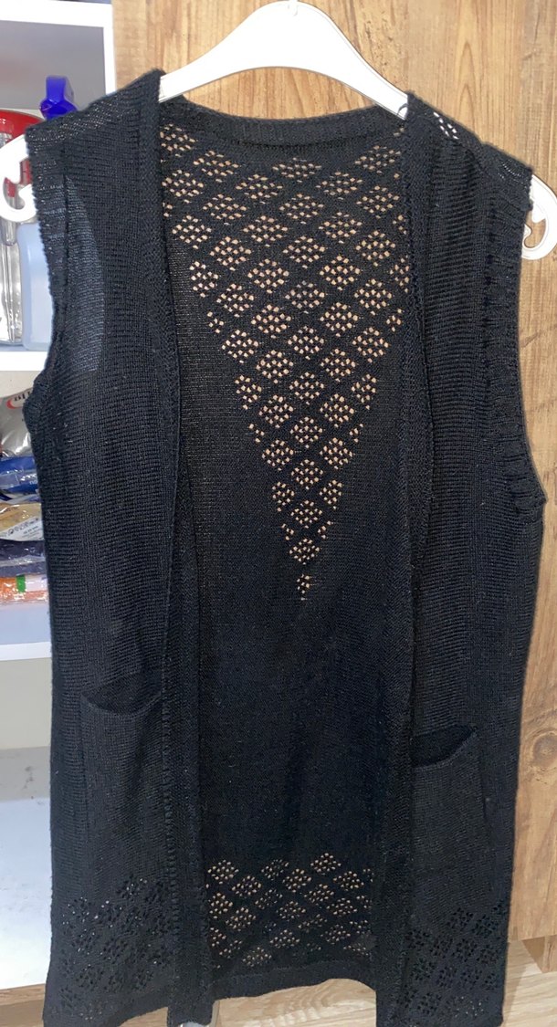 Siyah, V yakalı, kolsuz, örgü kumaştan yapılmış midi boy, bol kesim kadın yelektir. Ön kısmında açık örgü deseni bulunur, rahat ve şık bir seçenektir.