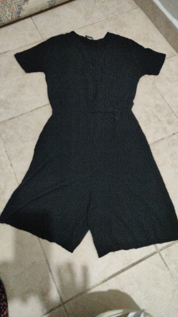 Siyah renkli, V yaka ve kısa kollu, yumuşak keten örgü dokulu, bol kesim midi uzunlukta kadın tulum. Rahat ve şık sokak stili için uygun.