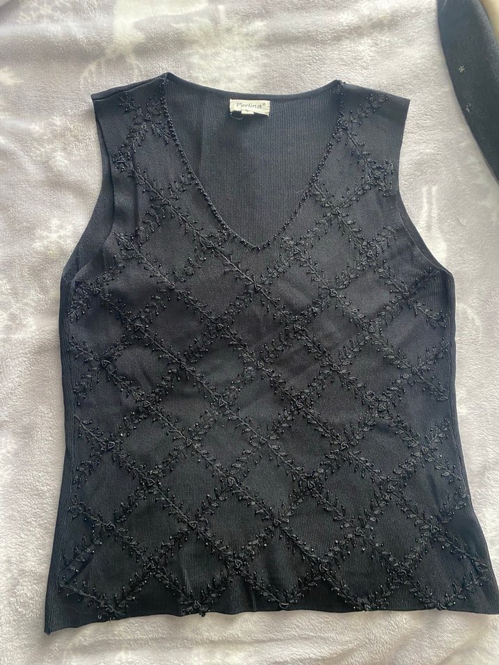 Siyah, V yakalı, kolsuz ve örgü desenli keten kumaştan yapılmış, vücuda oturan kadın atlet.
