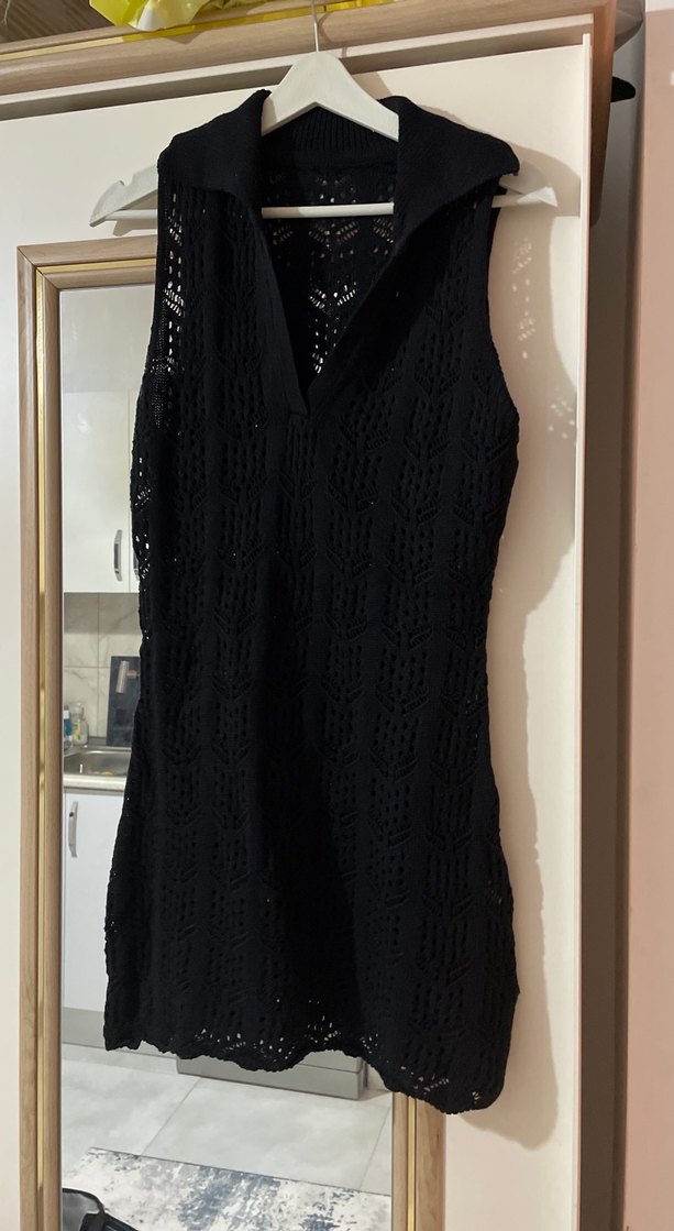 Siyah, v yaka, kolsuz, vücuda oturan örgü midi elbise, gotik tarzıyla günlük kullanıma uygundur. Plaj elbisesi örgü hiç giyilmedi s beden uyumlu boy 85
