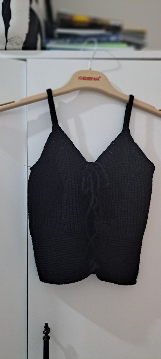 Siyah, örgü dokulu, ince askılı, V yaka ve kısa boylu mini bir atlet. Ön kısmında bağcıklı detay bulunur, günlük kullanıma uygun rahat ve şık bir parça.