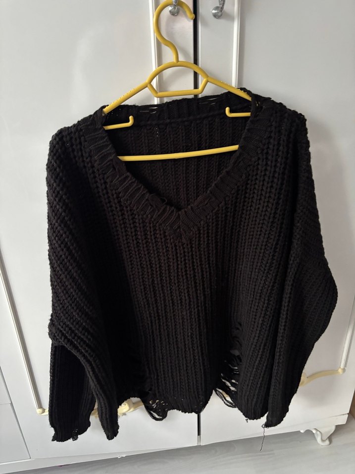 Siyah renkli, V yaka, uzun kollu ve midi boyda örgü kazak. Salaş kesimi ve rahat dokusuyla günlük kullanıma uygundur.