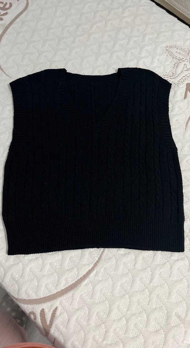Siyah örgü, kolsuz, V yaka ve bol kesim süveter, günlük kullanıma uygun rahat ve trend bir tarz sunar.