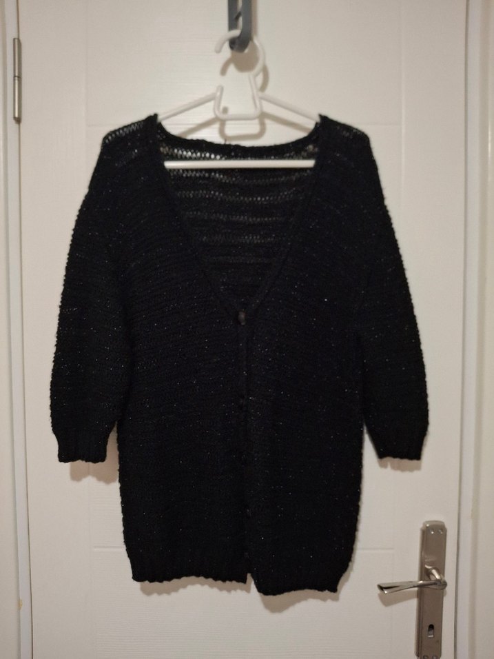 M beden Siyah renkli, V yaka ve uzun kollu, örgü kumaştan yapılmış, midi boy ve bol kesim kadın hırkasıdır. Desensiz yapısıyla gündelik kullanıma uygundur. sorunsuz tertemiz yepyeni ölçüleri resimlerde mevcut