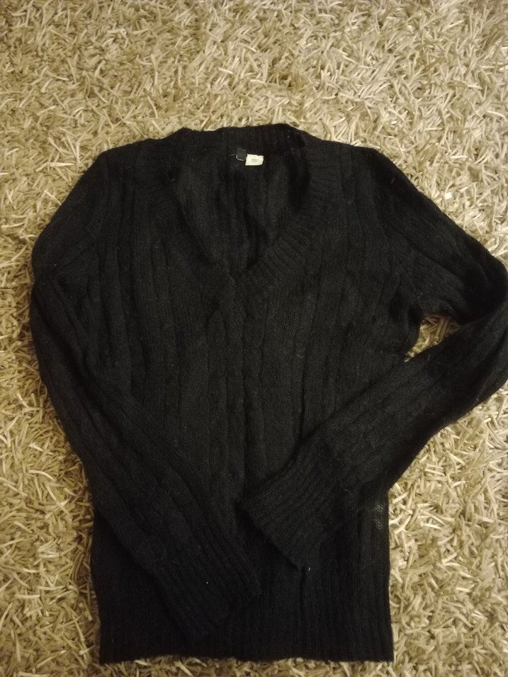 Siyah, v yaka, uzun kollu, yün örgü kumaştan yapılmış, orta boy, fitted kesim kadın kazak. Günlük kullanıma uygun, rahat ve gotik tarzda.