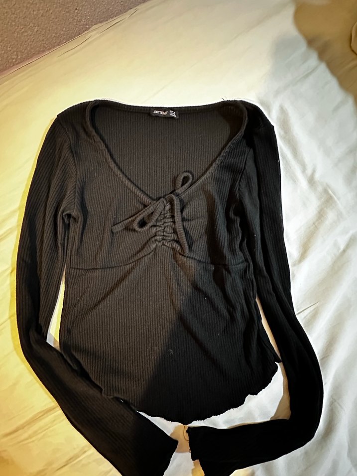 V yaka, örme dokulu, uzun kollu ve midi boyda siyah fitted bluz. Gotik ve trend günlük tarzlar için uygundur.